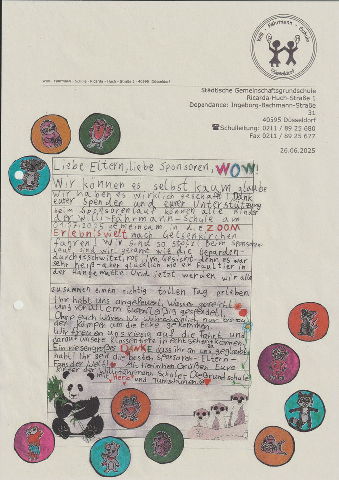 Gegen Ende des Schuljahres 2024/25 haben die Schülerinnen und Schüler der Willi-Fährmann-Schule noch einmal Vollgas gegeben. Um das Geld für einen großen Ausflug der ganzen Schule in die Zoom-Erlebniswelt zu erlaufen, haben sich alle 11 Klassen in Hellerhof vor dem Schulgelände getroffen und sind mit großem Eifer Runde um Runde um die große Wiese vor der Schule gelaufen. Trotz brennender Sonne am gefühlt heißesten Tag des Jahres hatten alle sichtbar großen Spaß an der Aktion und die Kinder gaben Runde für Runde ihr Bestes. Womit bei der Planung des Sponsorenlaufs niemand gerechnet hatte, war die unglaubliche Großzügigkeit der vielen Sponsoren, die die Kinder sich selbst gesucht hatten. Dank der vielen lieben Freunde, Bekannten und Familienmitglieder unserer Schulkinder ist eine riesige Summe Spendengelder zusammengekommen, wodurch der Ausflug in die Zoom-Erlebniswelt für alle Kinder der Willi-Fährmann-Schule ermöglicht werden konnte. Vielen Dank!